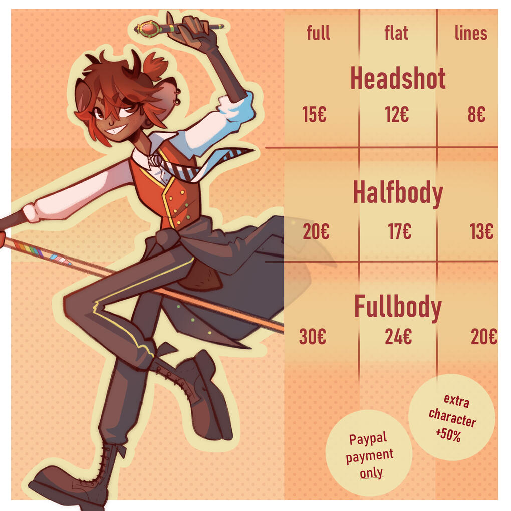 2. PAYMENTI am accepting payment only via paypalCommissions can be paid either 100% upfront or split 50% upfront and 50% after sketch approval.Don't send me any payment before I have agreed to give you a slot and requested you to send me the payment.