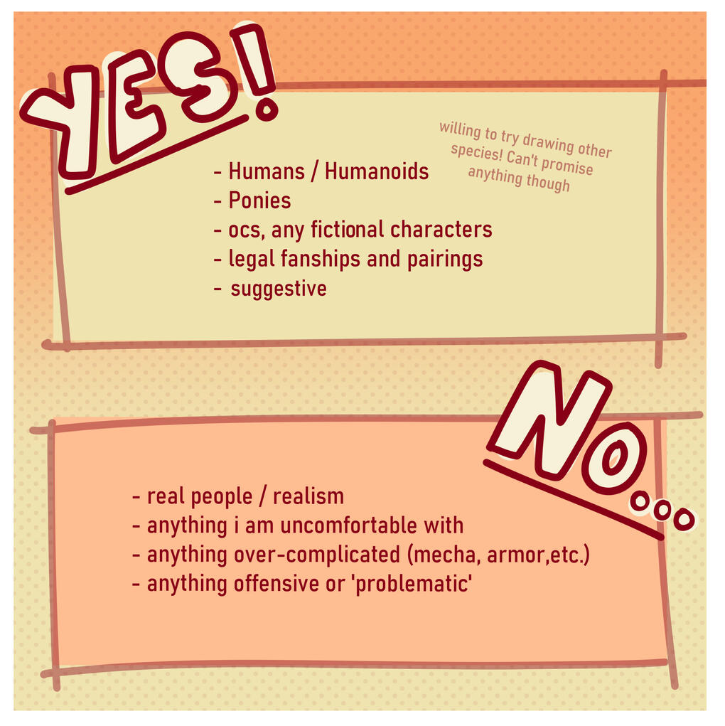 1. GENERAL TERMSAll drawings may or will include a subtle sign that you may not remove.I might record the drawing process and post it on any of my social medias.Prices are not subject to change.I have the right to reject any order that I do not feel comfortable drawing for any reason.